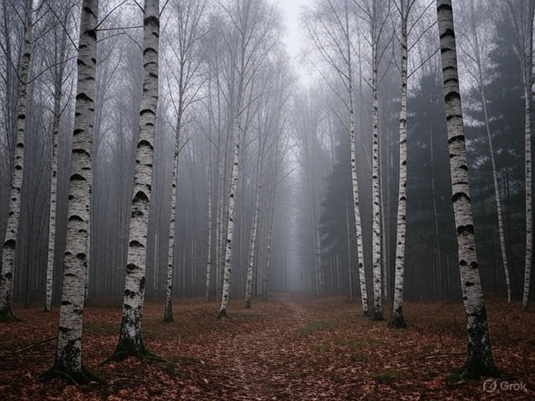 Grokへのリクエストは『白樺の林、寒そうだけど雪は降っていない風景を描いて』です📱