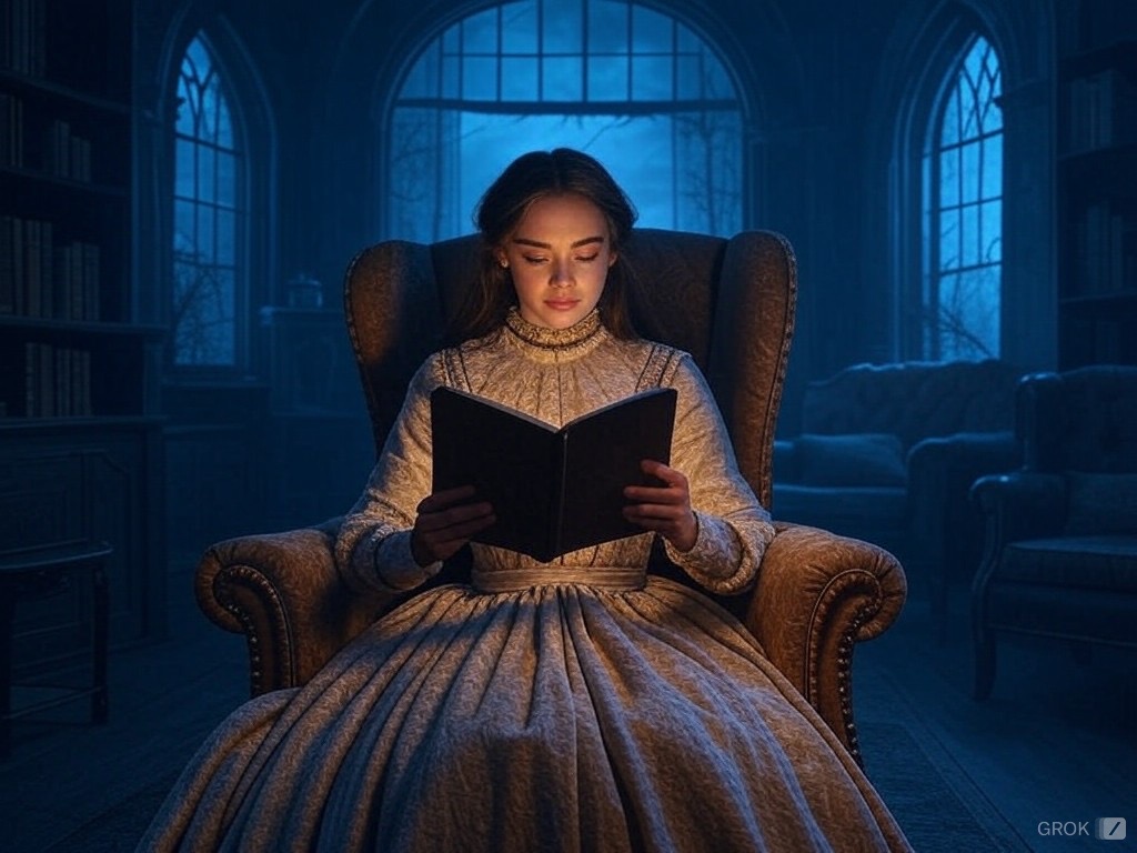『夜、荘厳な洋館で怖い話を朗読している美しい女性を描いて』