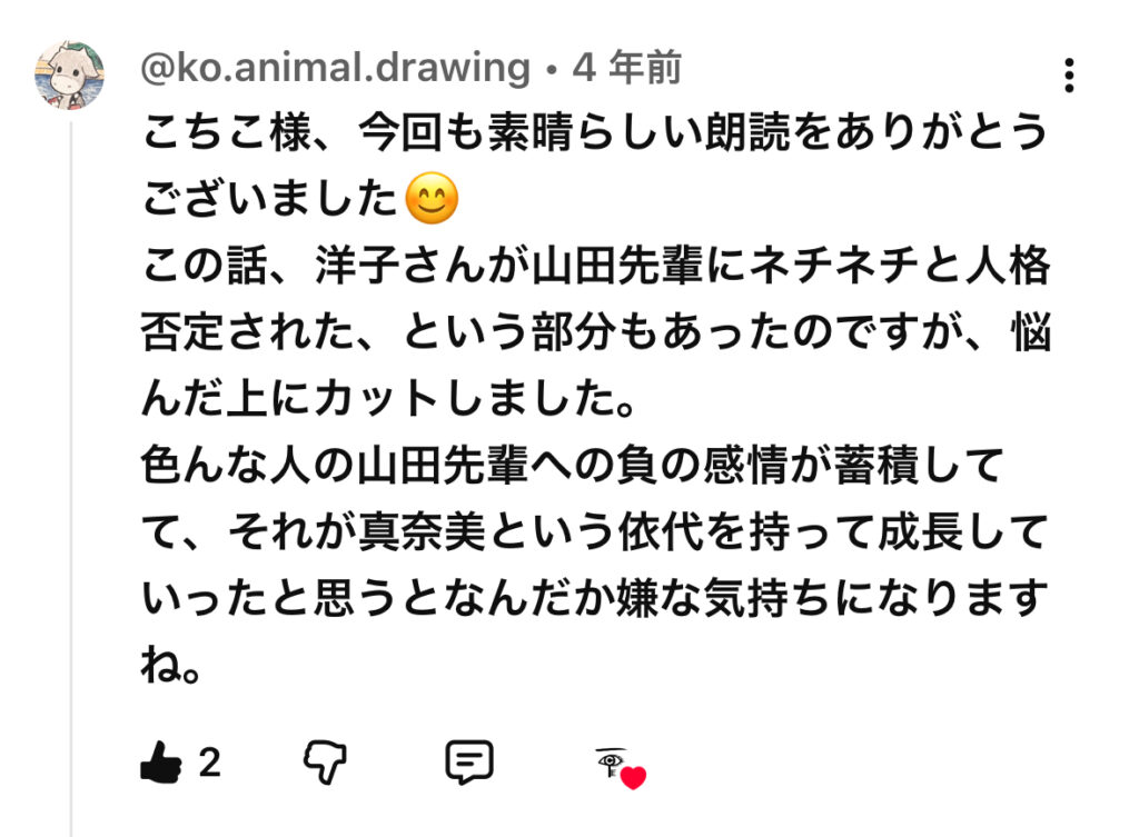 この返信から察するに、私自身は「真奈美」をサイトを粘着にストーカーしている女性=ヒトコワと考えていたことが窺え、“4年前の私は真奈美にそういった感想を抱いていたのか〜”と、こちらにもちょっぴり感動しちゃいました🥹