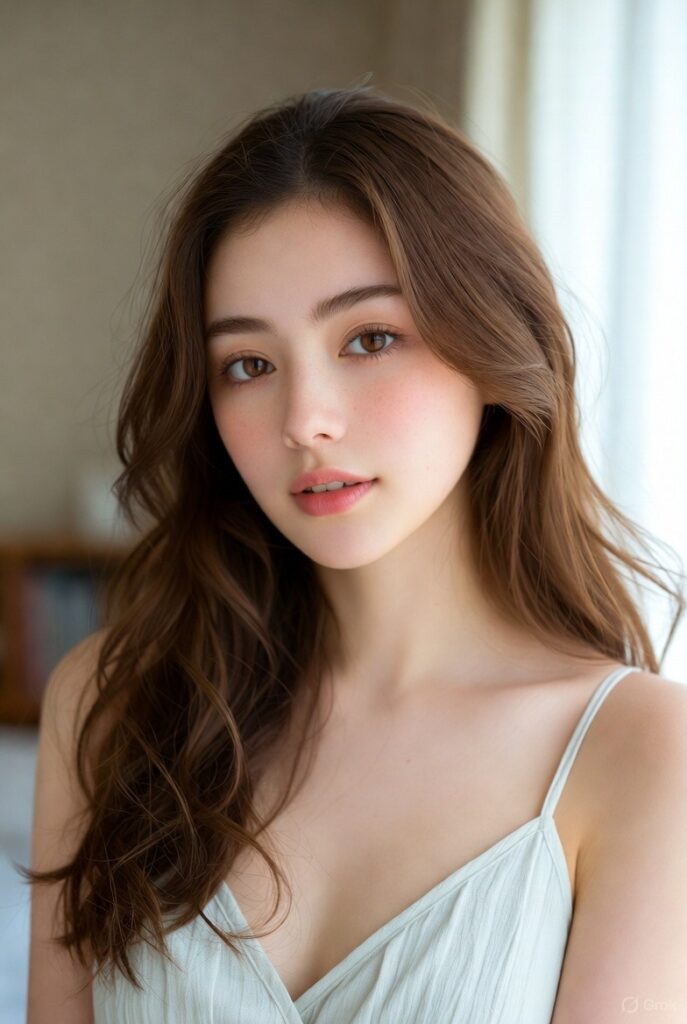 Grokへの注文はこう→清楚なイメージの女子大の英文科で学ぶ一年生。引っ込み思案で彼氏がいたことはない。身長155㌢体重45㌔。茶髪のロングヘア。ワンピースを着るのが好き。色白で敏感肌で病弱。